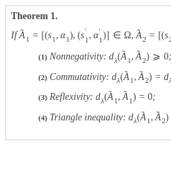 Step 3. Calculate the collective 2-tuple linguistic distance matrix $\tilde{R}={({\tilde{r}_{ij}})_{4\times 4}}={(({r_{ij}},{a_{ij}}))_{4\times 4}}$ by using the IT-HWD measure, which is proposed by Liu’s algorithm. Here, in order to eliminate the unnecessary impacts, we also suppose the objective weight vector $\omega ={(0.3193,0.3736,0.3071)^{T}}$, the subjective weight vector $W={(0.3,0.4,0.3)^{T}}$ and the parameter $\lambda =3$.